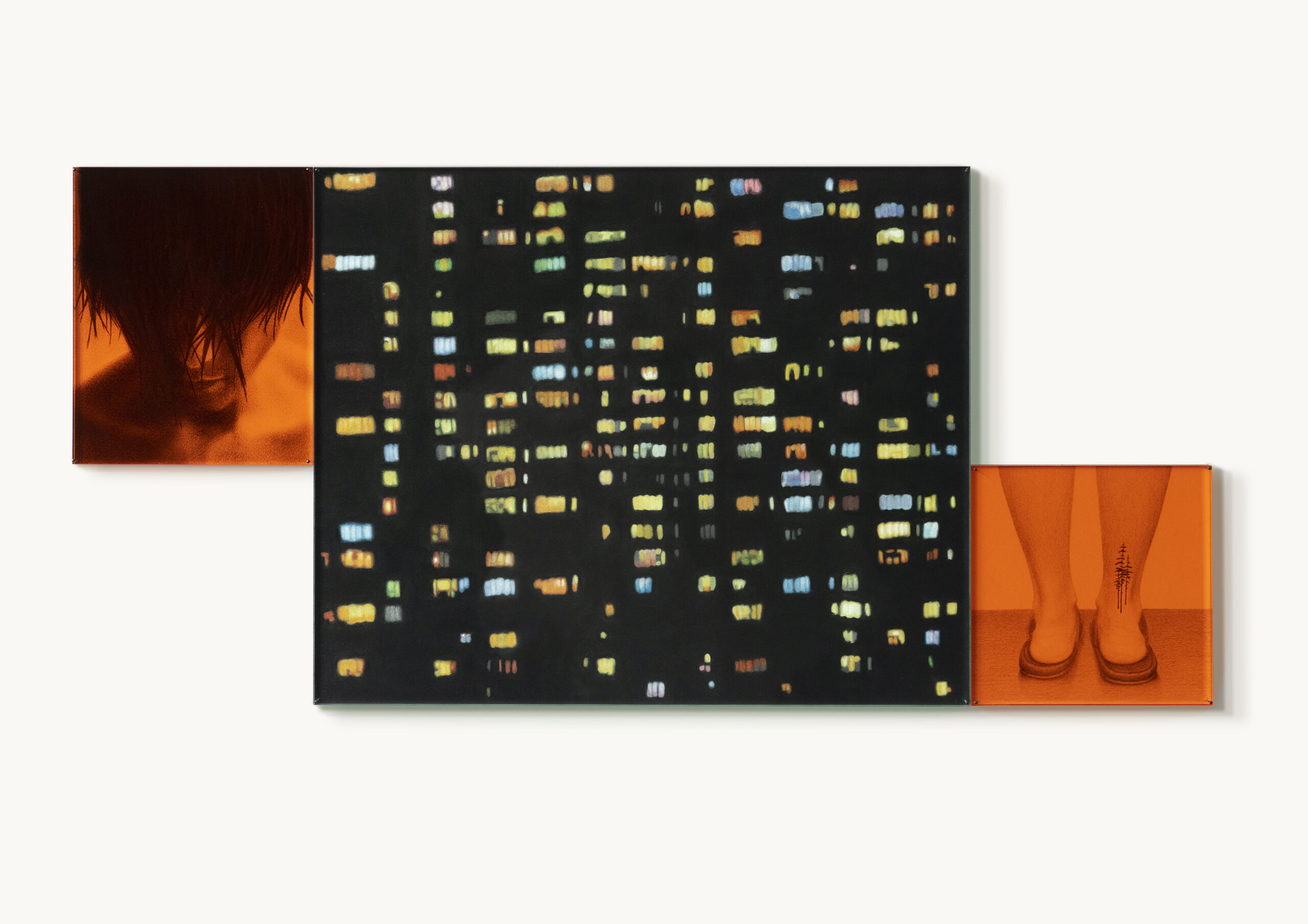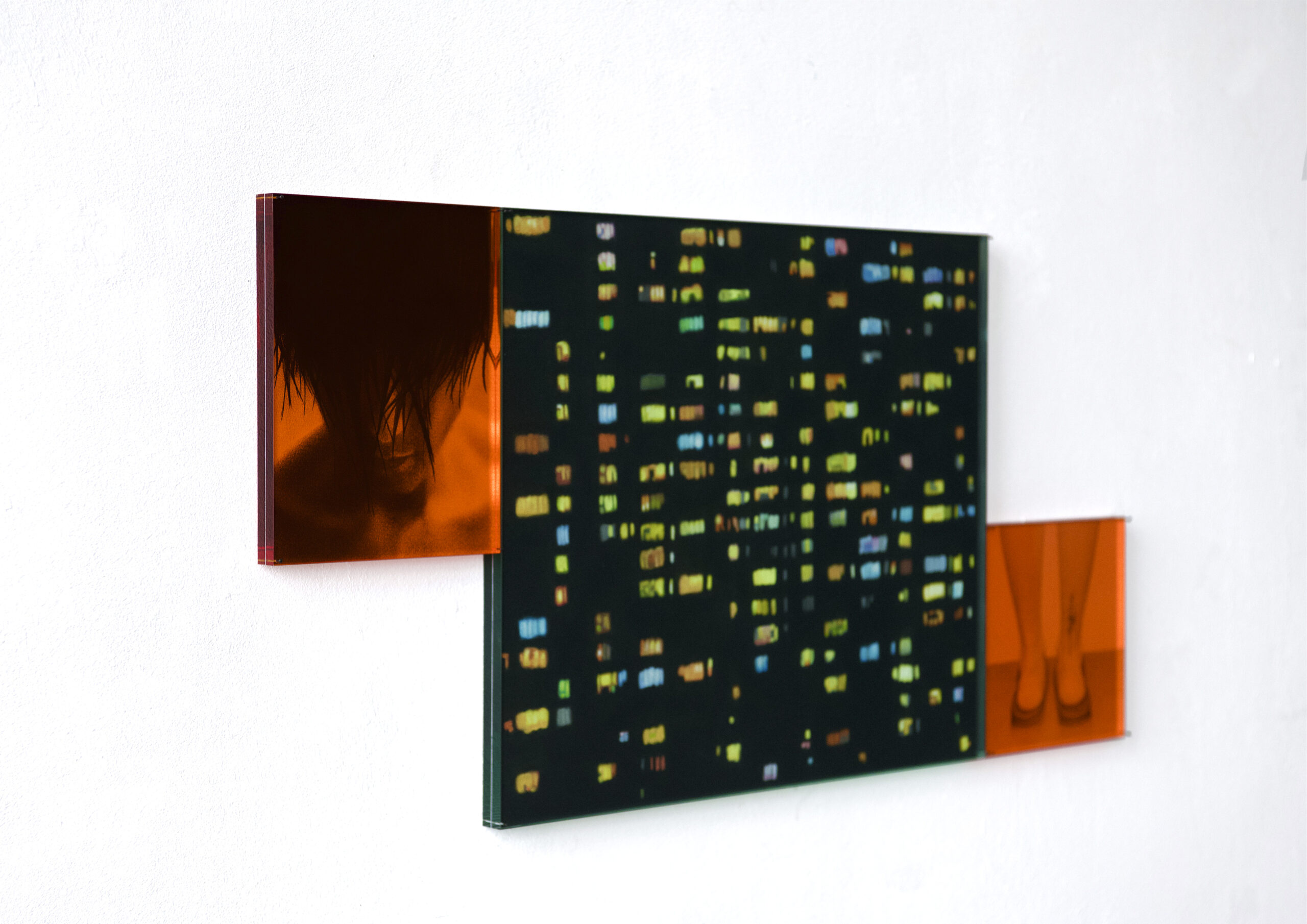 Semi Colon 6 (triptych) 2025 Drawing 20x16 + 36x44 + 16x16cm conté chalk on paper between colored 8mm Greencast Plexiglas Available from Studio Silvia B. I am interested in this work